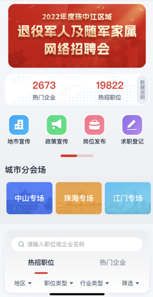 2022年度珠中江區(qū)域退役軍人及隨軍家屬網(wǎng)絡(luò)招聘會(huì)頁面。 主頁分設(shè)城市宣傳專區(qū)、政策宣傳專區(qū)、崗位發(fā)布入口、求職登記入口、求職訂閱服務(wù)、在線測評共六大功能板塊。 招聘會(huì)設(shè)置退役軍人就業(yè)指導(dǎo)員,根據(jù)就業(yè)及企業(yè)需求調(diào)研結(jié)果,對有求職意向的退役軍人和隨軍家屬提供精準(zhǔn)匹配及推送、政策咨詢、簡歷指導(dǎo)、崗位推薦等就業(yè)指導(dǎo)服務(wù)。 一、求職登記流程 1、求職登記 手機(jī)掃碼進(jìn)入【2022年度珠中江區(qū)域退役軍人及隨軍家屬網(wǎng)絡(luò)招聘會(huì)】,電腦端可通過文章左下方原文鏈接進(jìn)入專場。點(diǎn)擊【求職登記】即可登記,登記成功后,企業(yè)HR可以通過平臺(tái)與求職者聯(lián)系溝通。