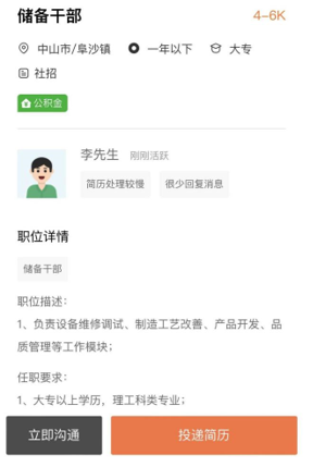 ▲求職者注冊流程 3、投遞簡歷 完善注冊信息后,即可跳轉(zhuǎn)至【2022年度珠中江區(qū)域退役軍人及隨軍家屬網(wǎng)絡(luò)招聘會(huì)】,點(diǎn)擊職位名稱可進(jìn)入相應(yīng)職位詳情頁,點(diǎn)擊企業(yè)可進(jìn)入企業(yè)詳情頁,可查看企業(yè)發(fā)布的在線職位。 點(diǎn)擊職位詳情頁左下方【立即溝通】可和HR進(jìn)行溝通,點(diǎn)擊右下方【投遞簡歷】即可完成投遞。