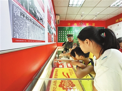 三角鎮(zhèn)老兵翁錦泉在鎮(zhèn)退役軍人服務中心榮譽室向小朋友介紹軍用物品和紀念章。