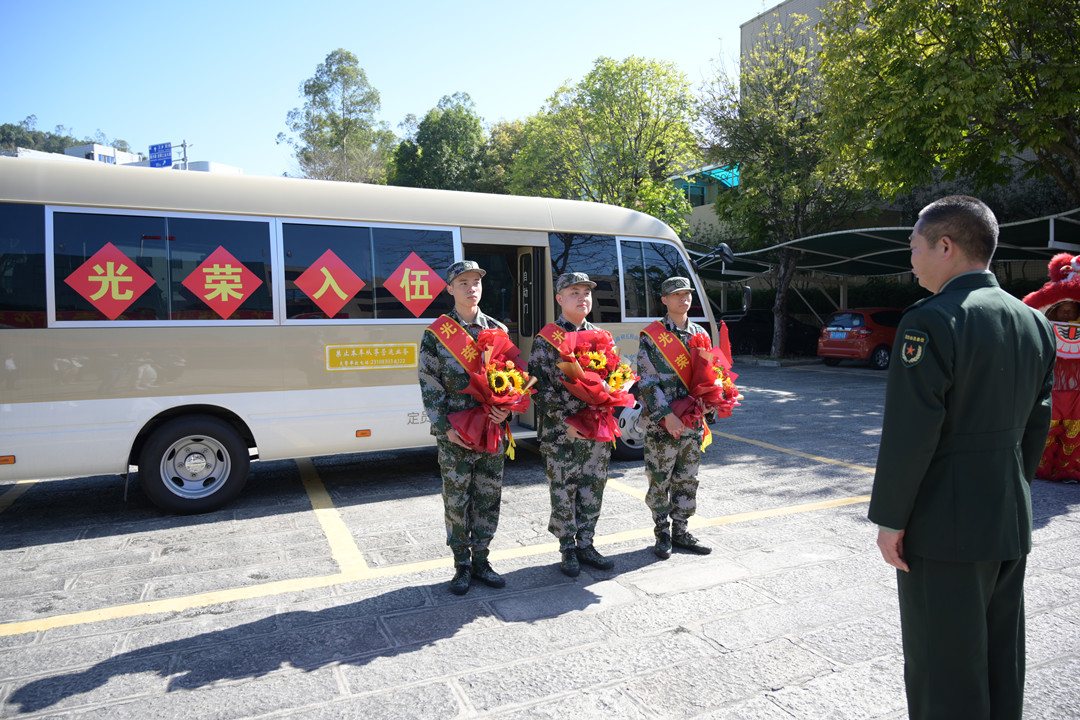 葉陽浩、胡家威兩名準(zhǔn)新兵身披“光榮入伍”的紅色綬帶和大紅花昂首挺胸站在太陽下,新兵家屬前來歡送。“陽浩的堂叔叔、外公和叔公都曾應(yīng)征入伍,他能進(jìn)部隊得到鍛煉,我們作為他的父母感到很光榮、很幸福?!比~陽浩的父母胸戴“光榮家屬”的大紅花,露出激動的笑容。