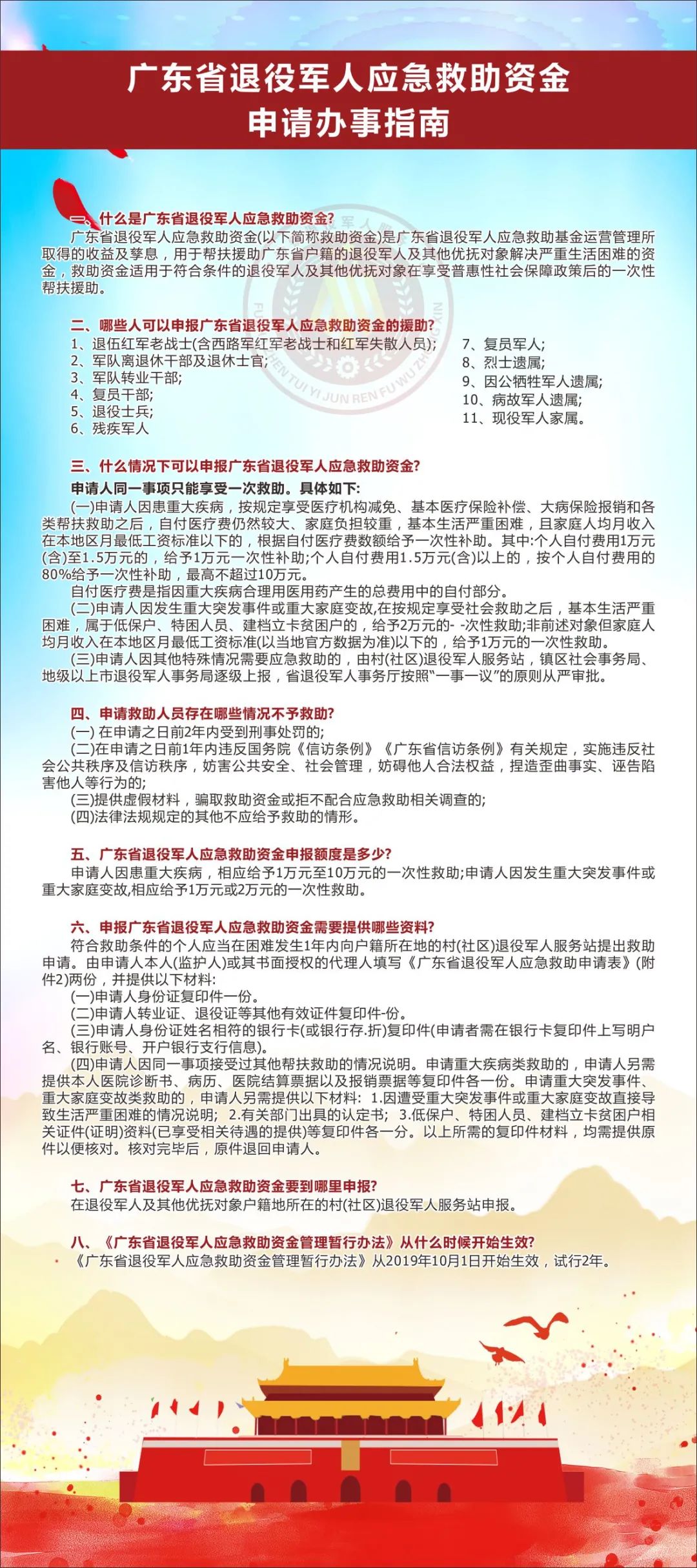 廣東省退役軍人應急救助資金自2019年7月設立以來,為我市退役軍人及其他優(yōu)撫對象提供了有力的幫扶援助。 其救助類型主要分為四類:申請人因患重大疾病、發(fā)生重大突發(fā)事件、發(fā)生重大家庭變故或其他特殊情況導致基本生活嚴重困難的。符合條件的申請人可向戶籍地所在的村(社區(qū))退役軍人服務站進行申請。 |