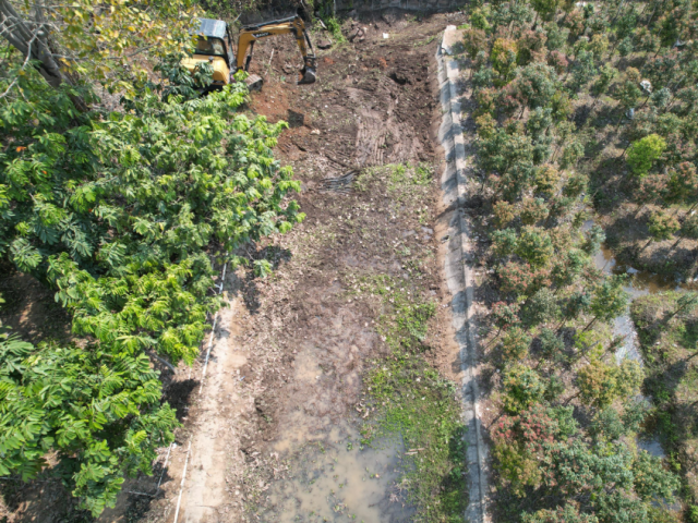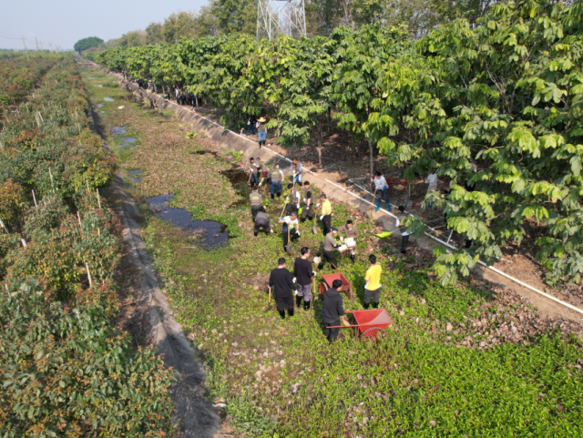 為提高清淤工作效率,結(jié)合木圍排灌渠兩側(cè)岸坡均已密植花木實(shí)際情況,本次活動(dòng)采取了“挖機(jī)+人工”的清淤方式,由挖掘機(jī)將排灌渠內(nèi)雜草、淤泥集中清理堆至渠外空地,再由人工精細(xì)作業(yè),轉(zhuǎn)運(yùn)淤泥雜草至花木間區(qū)域平鋪晾曬改良土壤、增強(qiáng)肥力。