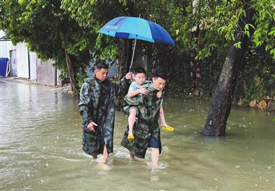 當天10時50分,三鄉(xiāng)鎮(zhèn)泉眼村內(nèi)多處路段發(fā)生水浸,退役軍人梁卓興和泉眼村消防站隊員巡查到泉源路16號路段時,發(fā)現(xiàn)一名小朋友因水浸無法回家,于是他們上前詢問孩子父母的聯(lián)系方式及家庭地址,隨后背起小朋友,把他安全送回家。