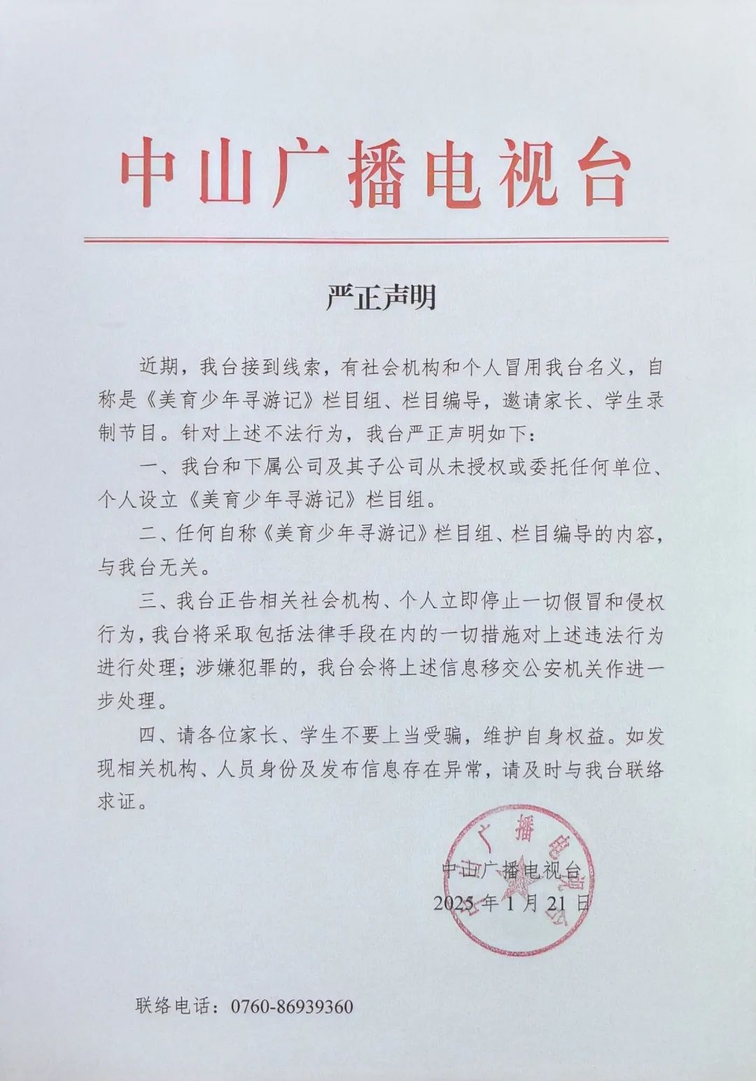 針對《美育少年尋游記》欄目組的不法行為,中山廣播電視臺(tái)在此發(fā)出嚴(yán)正聲明: