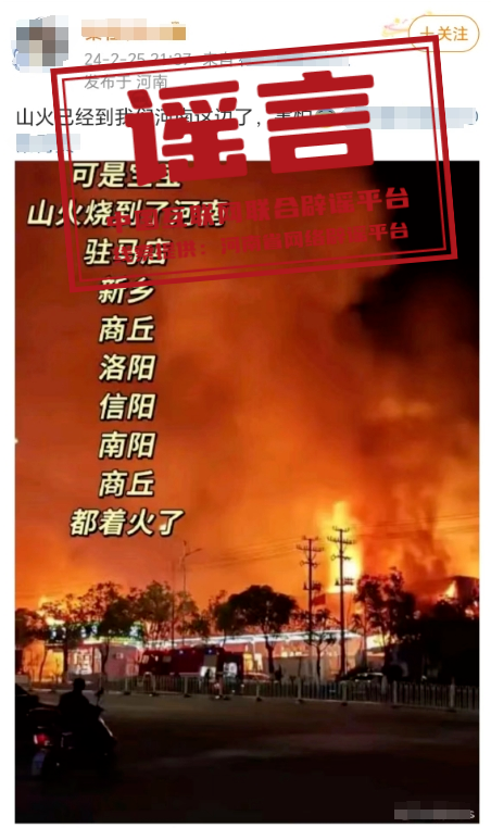 真相:近日,有網(wǎng)民在網(wǎng)絡(luò)平臺(tái)發(fā)布“山火燒到了河南”信息,并配上多張火災(zāi)圖片。經(jīng)河南省網(wǎng)絡(luò)辟謠平臺(tái)向該省林業(yè)局等相關(guān)部門核查,截至2月26日河南省域內(nèi)未發(fā)生山火,網(wǎng)傳信息為謠言。(來(lái)源:河南省網(wǎng)絡(luò)辟謠平臺(tái))