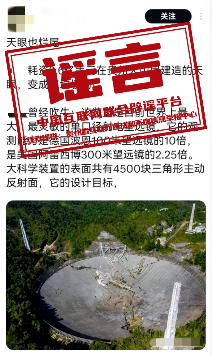 真相:近日,海外社交平臺(tái)有網(wǎng)民發(fā)布一張圖片,聲稱“耗資2.6億美元在貴州大山里建造的天眼,變成了垃圾場!”對此,“貴州辟謠”官方微信公眾號(hào)發(fā)布消息稱,網(wǎng)傳說法為謠傳,網(wǎng)傳圖片實(shí)為美國波多黎各的阿雷西博天文臺(tái)(Arecibo Observatory)于2020年12月發(fā)生徹底坍塌的畫面,該天文臺(tái)主要的觀測裝置為阿雷西博射電望遠(yuǎn)鏡。事實(shí)上,這并非“中國天眼”第一次“被坍塌”,2020年阿雷西博望遠(yuǎn)鏡第一次出現(xiàn)嚴(yán)重?fù)p壞之際,網(wǎng)絡(luò)中就曾出現(xiàn)過類似謠言。