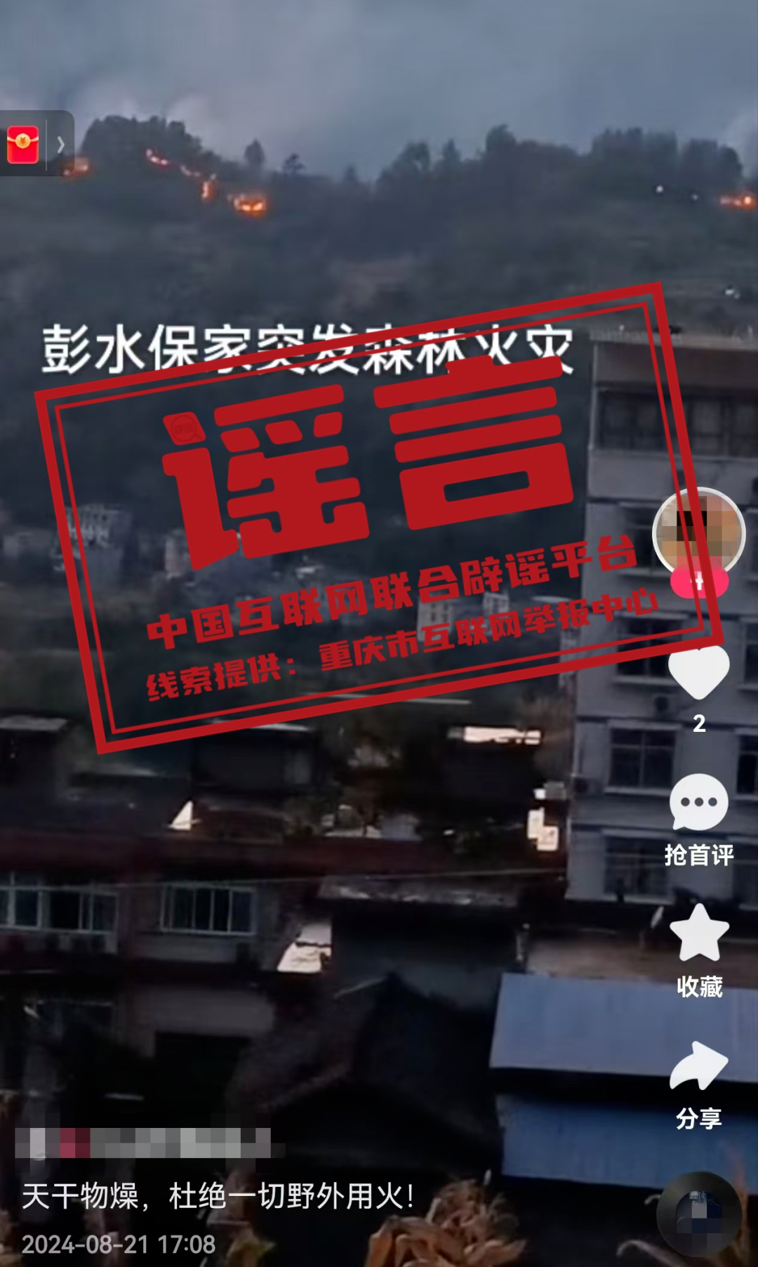 真相:8月21日,某網(wǎng)民發(fā)布視頻并配文“彭水保家突發(fā)森林火災(zāi)”,引發(fā)關(guān)注。經(jīng)屬地網(wǎng)信部門(mén)核實(shí),重慶彭水近期未發(fā)生此類(lèi)事件,網(wǎng)傳信息系謠言。目前,謠言線索已轉(zhuǎn)交相關(guān)部門(mén)對(duì)造謠者進(jìn)行進(jìn)一步調(diào)查處置。(來(lái)源:@重慶辟謠)
